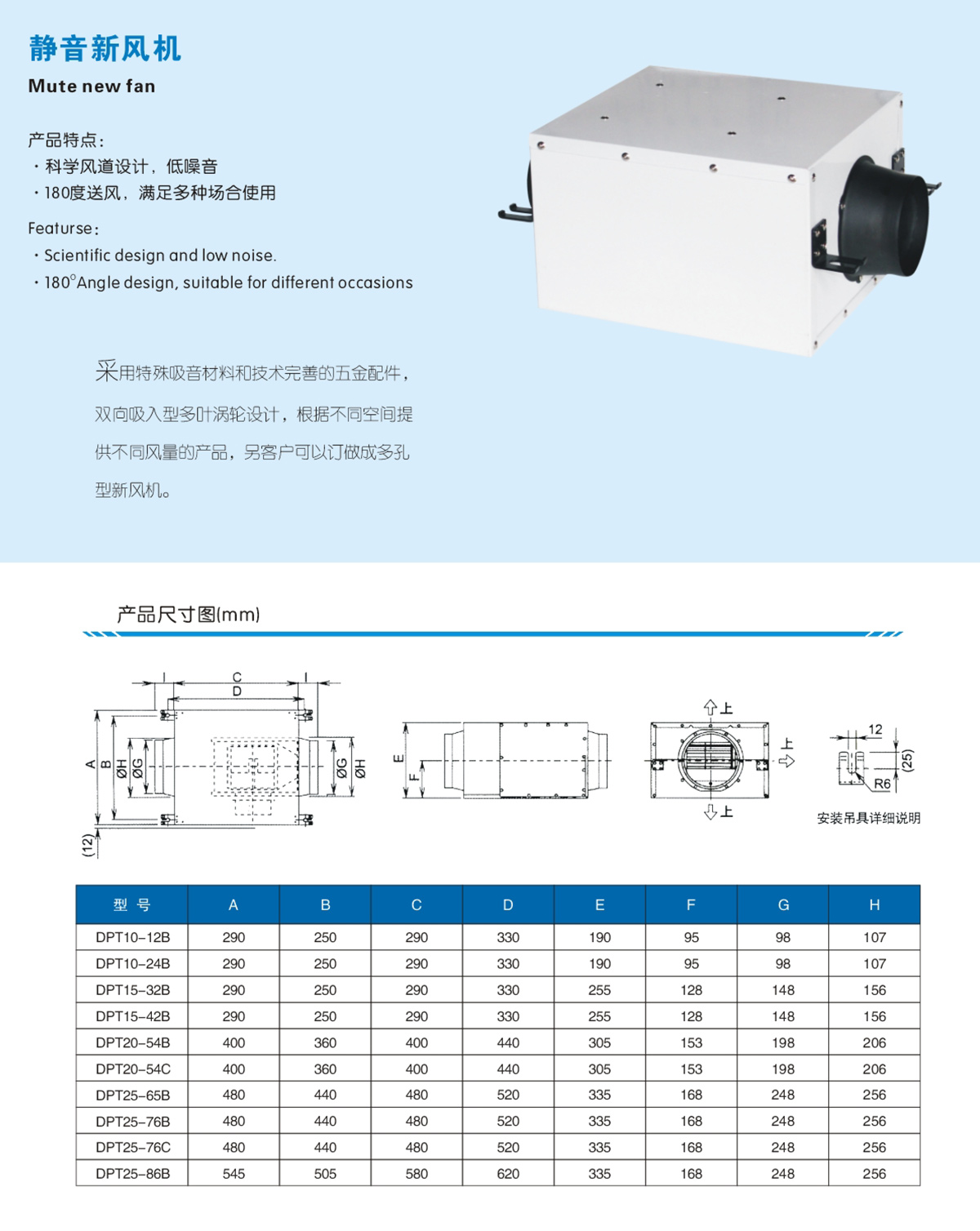 用特殊吸音材料和技術(shù)完善的五金配件, 雙向吸入型多葉滿輪設(shè)計,根據(jù)不同空間提供不同風量的產(chǎn)品,另客戶可以〇做成多孔型新風機。